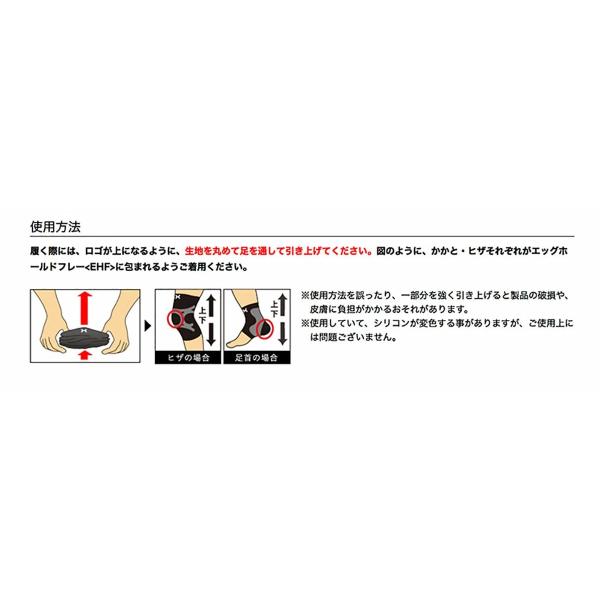 使用方法 履く際には、ロゴが上になるように、生地を丸めて足を通して引き上げてください。ヒザがシリコンフレームに包まれるようご着用ください。