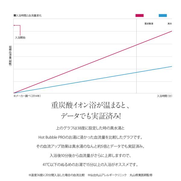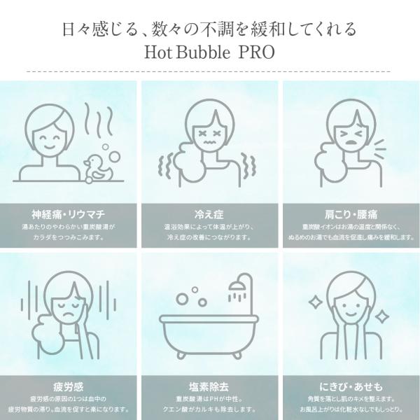 Hot Bubble PRO(ホットバブルプロ)は、ドイツの自然炭酸湯を研究し、独自の製法で開発された中性重炭酸入浴剤です。お湯に溶かすと、重炭酸イオンが長時間残り、肩こりや腰痛、冷え症などに効果的です。160Lのお湯に3錠を溶かし、15分以上の入浴をおすすめします。洗髪や洗顔にも使用可能。肩こり、疲労回復、神経痛、リウマチ、しっしんなどにも効果があります。成分は炭酸水素ナトリウム、炭酸ナトリウム、無水クエン酸など。保存は冷暗所で保管してください。