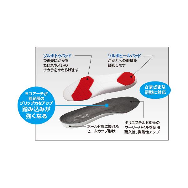 一体成型で本体にデザインした意匠により、屈曲性、フィット性が向上したソルボライトは、スポーツに対応した次世代の衝撃吸収インソールです。 ソルボヒールパッド、ソルボトゥパッドがかかとへの衝撃や複雑なステップの時にかかるトルク(ねじれの力)の負担を軽減します。