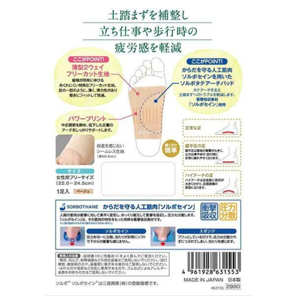 ソルボ タテアーチ シームレスサポーター 女性用 フリーサイズ 日本製 足裏アーチ サポーター 扁平足 偏平足 ハイアーチ 縦アーチ