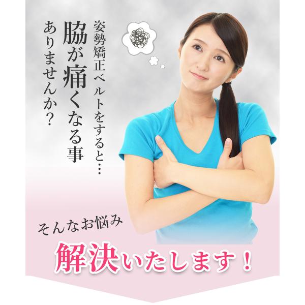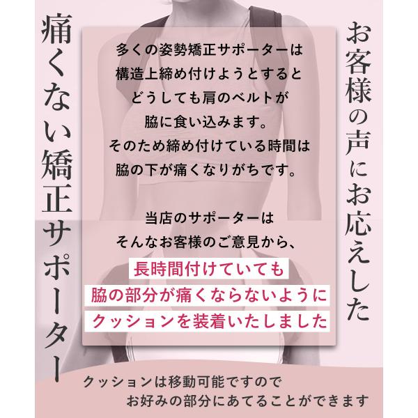 姿勢矯正ベルトは基本的な構造上、肩を外側に開かせる仕組みになっており、矯正しようと強く締め付ければ締め付けるほど、肩のベルトが脇に食い込んで長時間の装着や動いていると脇が痛くなってきます。せっかく姿勢を矯正しようとしているのに脇が痛くなるから、肩を動かさないように意識してしまい逆に筋肉が固まってしまう事もあります。当店の商品はそんなお客様のレビューを多く見て、脇が痛くなりにくいように厚めのクッションを装着いたしました。脇が痛くなりにくいのでしっかりホールドして姿勢矯正をサポートいたします。背中には背筋部分に金属プレートを入れてサポート力をUPして、素材は蒸れにくいメッシュ素材を採用しました。動きやすさがなくならないよう腹部のベルトは伸縮性の高いベルトにしマジックテープでしっかり固定できます。