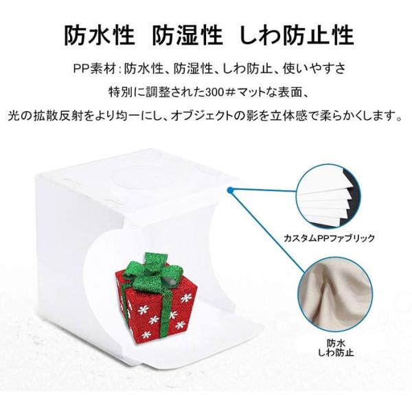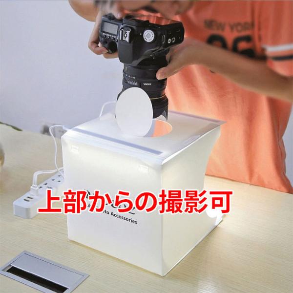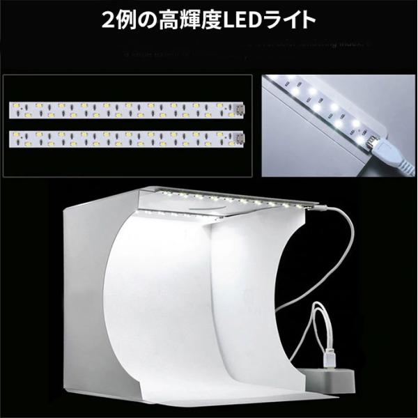 2例の高輝度LEDライト(2 x 20 LED数)光源を搭載して、十分な明るさを提供するため、被写体を明るく自然に撮影できます。自宅でもプロ級の撮影ができ、小物などの撮影に最適しています。