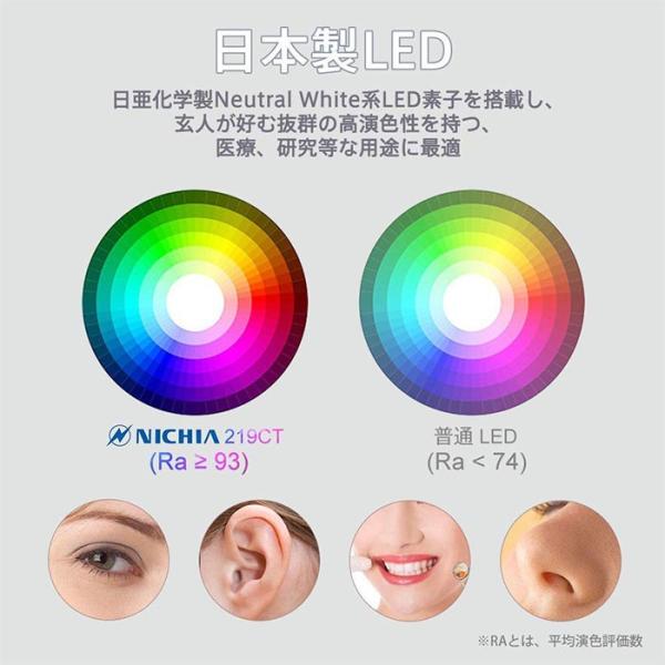 日亜化学(Nichia)製219-CT素子を搭載し、医療系や研究系のプロにも推薦する高演色性(Ra93)がこのLEDの特徴です。ペンライト自体は高品質の定電流回路を使用し、電池残量が少なくなっても安定的な高輝度を維持できます。