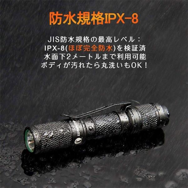 米CREE社製XP-G2 R5 LED素子を搭載し、10万時間(約11年間)の耐久性や驚くほどの明るさを実現した。本体は高品質の定電流回路を使用して、電池残量が少なくなっても安定的な高輝度を維持できます。