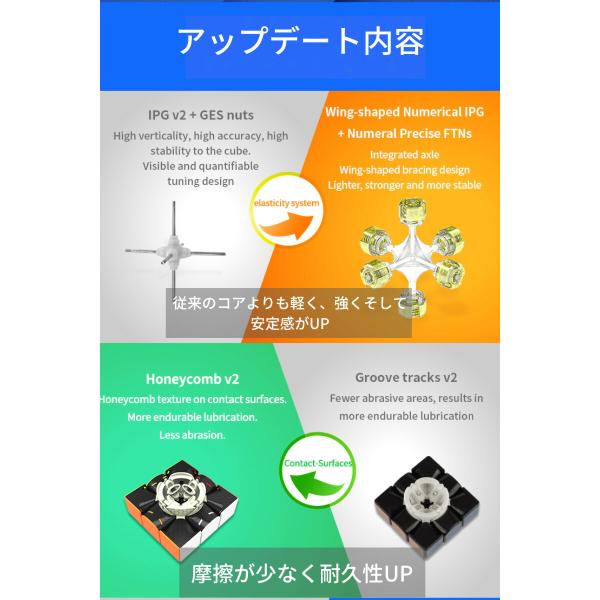 マグネットは非搭載ながら、GAN独自の高精度設計とハニカム構造により、引っかかりの少ないスムーズな回転を実現。潤滑剤が均一に広がる内部構造で、長時間の練習でも安定した操作感が続きます。