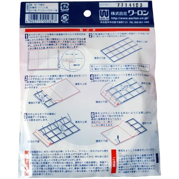 一般の両面テープで施工されますとハガレの原因になります。ワーロンPETシート、ワーロン耐水シートにつきましても建具への接着にご使用いただけます。