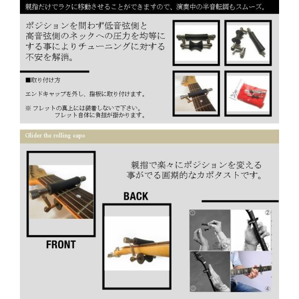・ギターに取り付けたまま、ポジションを簡単に移動できるプロミュージシャンにも愛用者が多い画期的なカポタストがグライダーカポです。