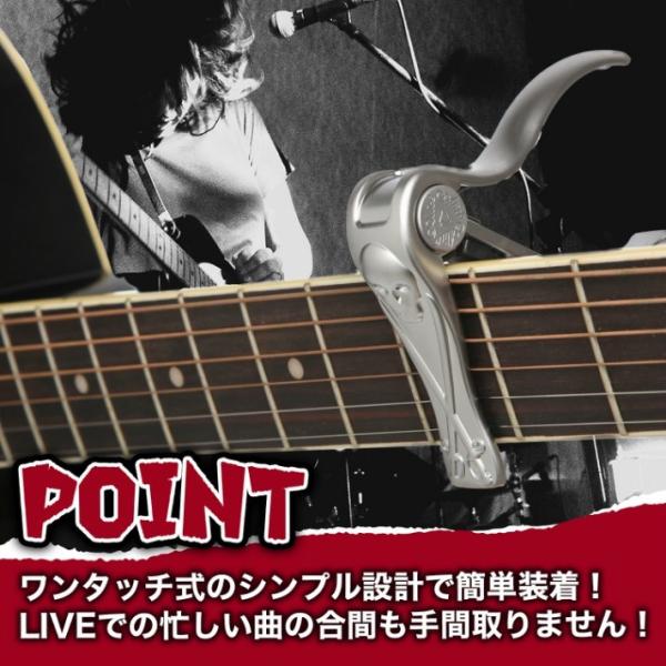 本体をネックに挟むだけで、簡単に装着できます。ここぞという時に使うカポタストですが、付けるのに手間取ると恥ずかしいモノです。あなたも一度はご経験があるのではないでしょうか?さらにこのせいで、その後の演奏に集中できなくなる可能性すらあるので、ワンタッチで脱着できるのは非常にありがたいですよね。また、使わない間はヘッドの先へ挟んでおけば、ライブ中でも一切のストレス無くスムーズな切り替えが可能です。