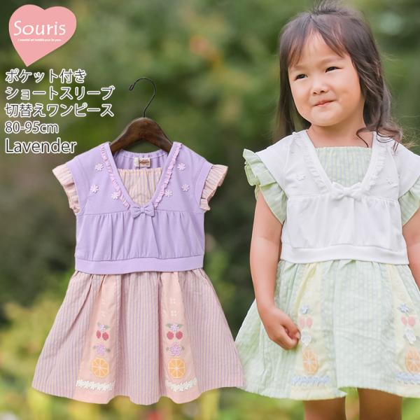 Souris ショートスリーブワンピース 切替 フルーツ刺しゅう ストライプ 女の子 ベビー 夏 ポケット付き 綿100% 半袖 お花 フラワー レース リボン 子供 子供服 ベビー服 ガーリー ラブリー スーリー 80 90 95 紫 白 133562【メール便対象】
