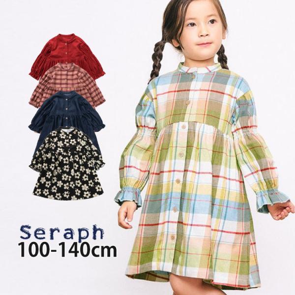 seraph 長袖前開きワンピース チェック柄 お花 フラワー 無地 カラー ひざ丈 長袖ワンピース まいにちワンピース セラフ S417035 子供 女の子