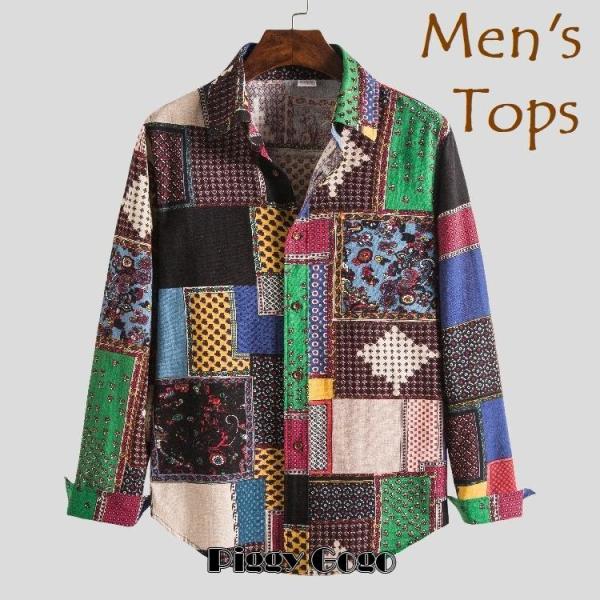 カジュアルシャツ メンズ 長袖 トップス 男性用 ワイシャツ Yシャツ 前ボタン 前開き 花柄 パッチワーク 柄シャツ おしゃれ ボヘミアンズ ファッ