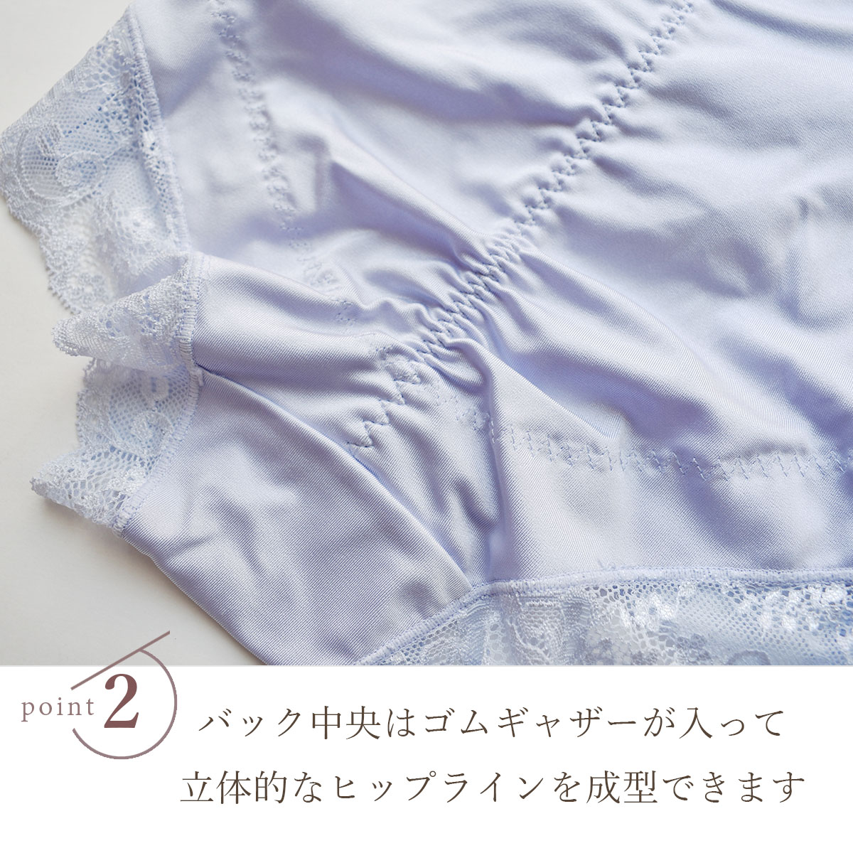 ウエスト付属のニッパーで骨盤を引き締め、本体のフロントパワーネットで下腹を抑えます。バックスタイルはヒップ下のパワーネットでヒップを引き上げ、中央にあるバックギャザーで上部のボリュームに対応。ギャザーでお尻の丸みをつぶさず、キレイなヒップラインをキープします。