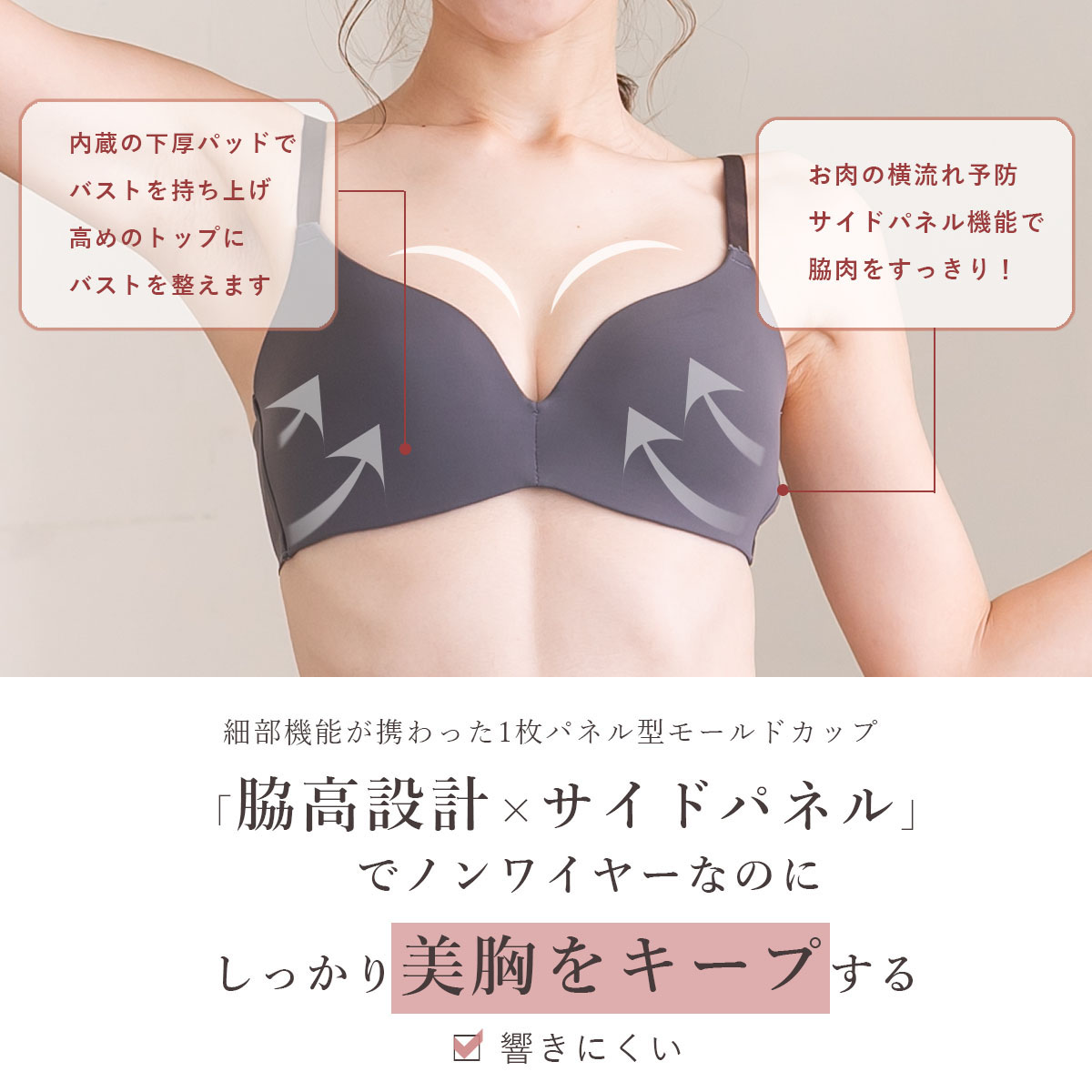 ひびきにくいだけでなく、脇高構造、サイドパネルで谷間メイク可能。
