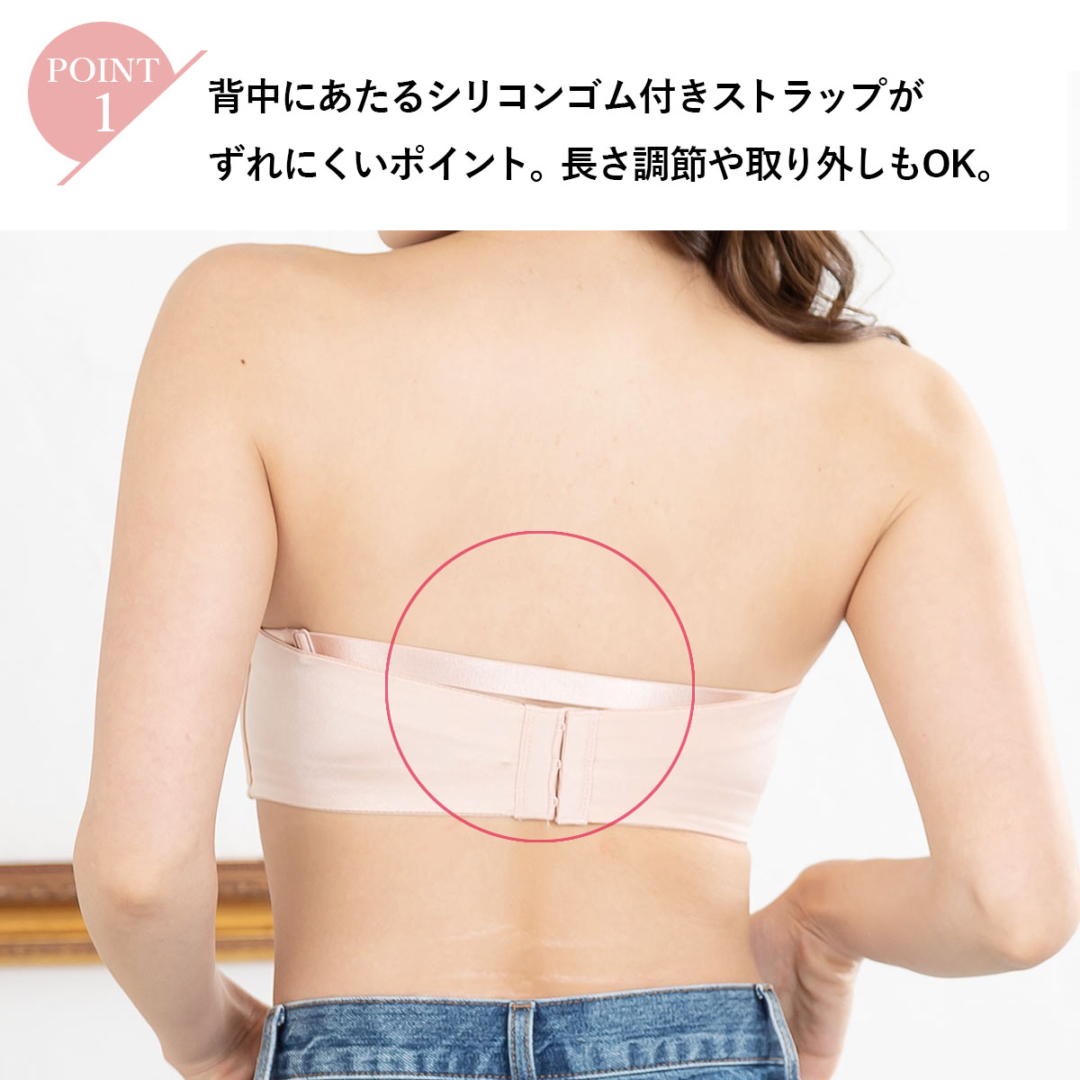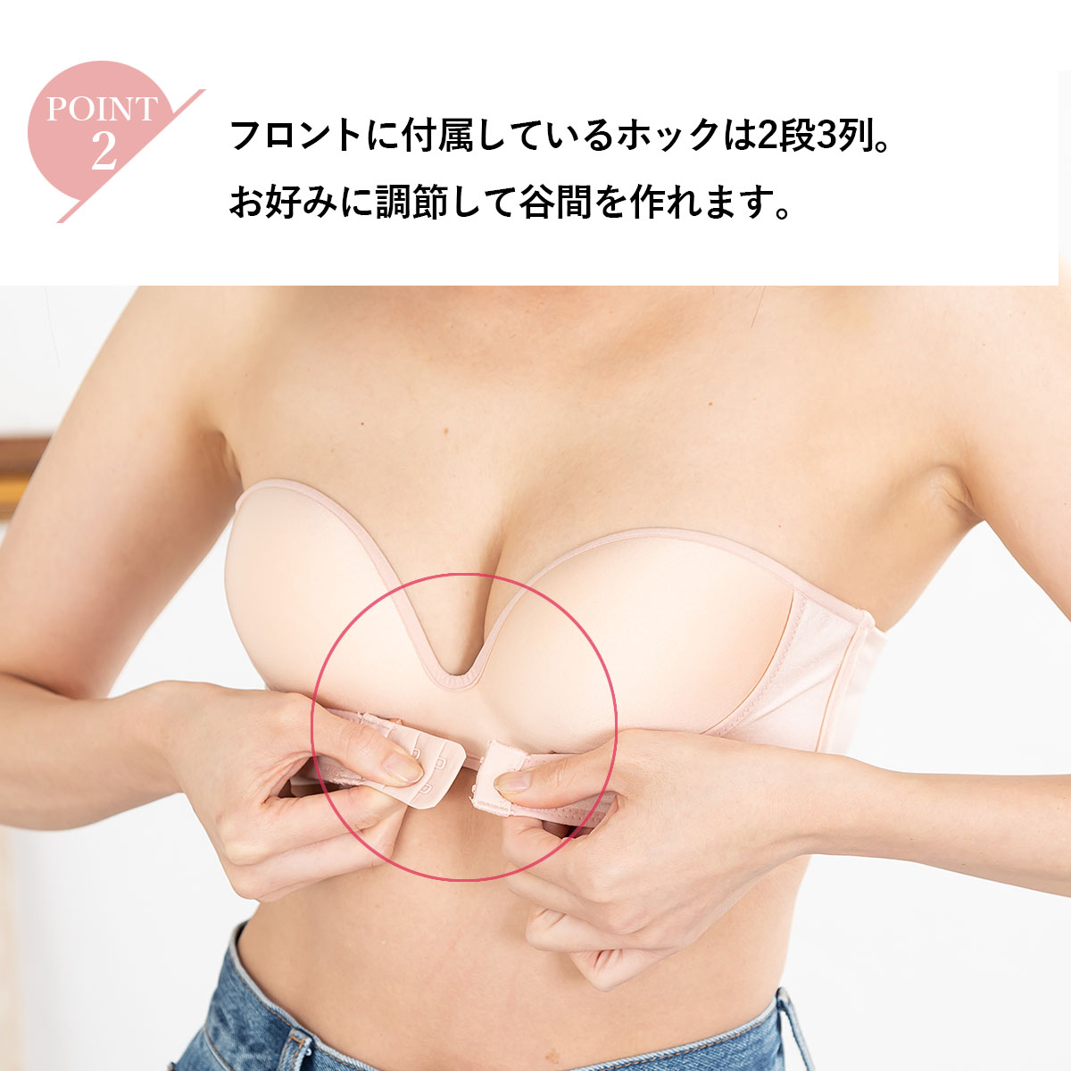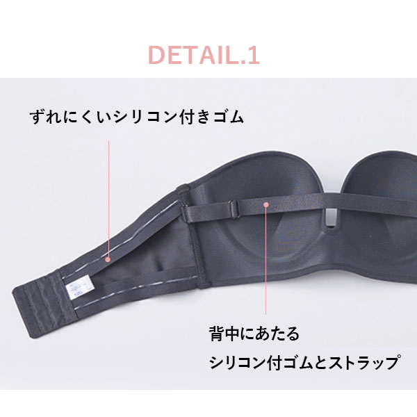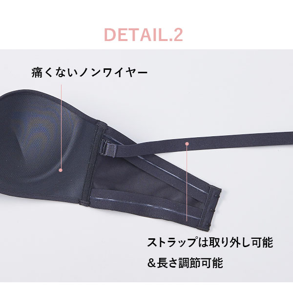 フ「ストラップレスは不安定…」そんなイメージを覆す安定感のあるダブルホック設計です。さらにズレない秘密は背中のシリコン付ゴムとストラップ。ノンワイヤーなので結婚式や謝恩会などで長時間着用しても痛くなりにくいのも特徴です。