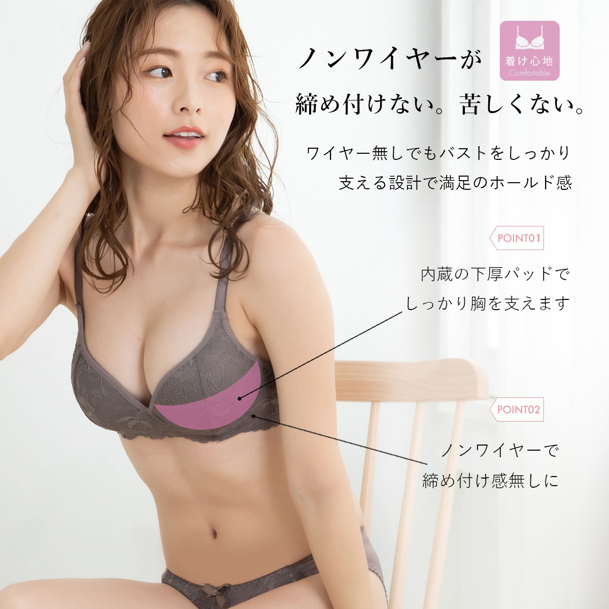 ストラップ取り外し:不可 ストラップ長さ調節:可 ワイヤー:無 脇ボーン:無 パッド:無