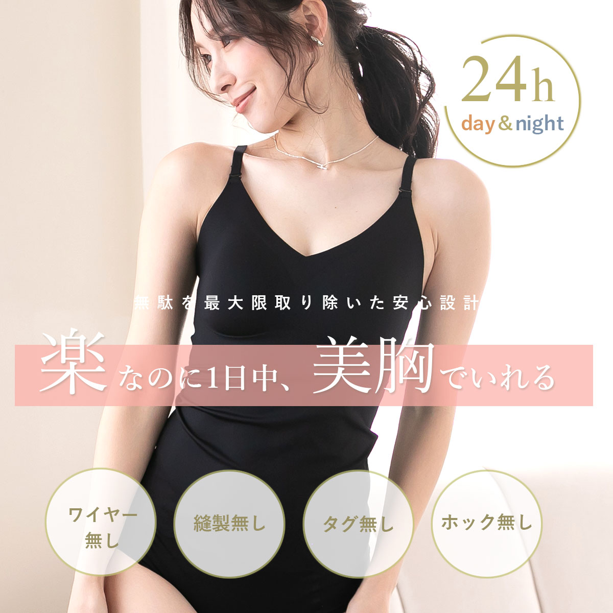 自然なバストメイクで楽して美胸シルエットに。生地に内蔵された脇高サイドパネル&アンダーリフトパネルがバストの流れを逃がさずキープ、ストレスフリーな着け心地。脇高でホールドされ、ハミ肉も逃げません。内蔵パッドに下厚クッション&サイド滑り止め加工がありバストの流れをストップ。