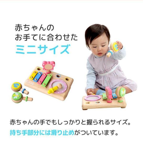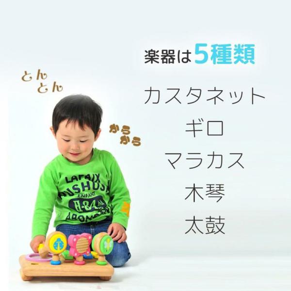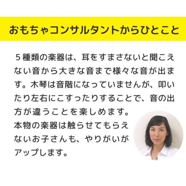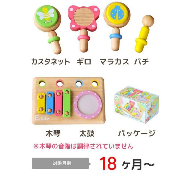 ラッピング 誕生日 1歳 出産祝い ベビーサイズのミニ楽器が詰まったミュージックセット。楽器はカスタネット、ギロ、マラカス、木琴、太鼓の5種類。はじめての音遊びにオススメです。無料ラッピングも承ります☆