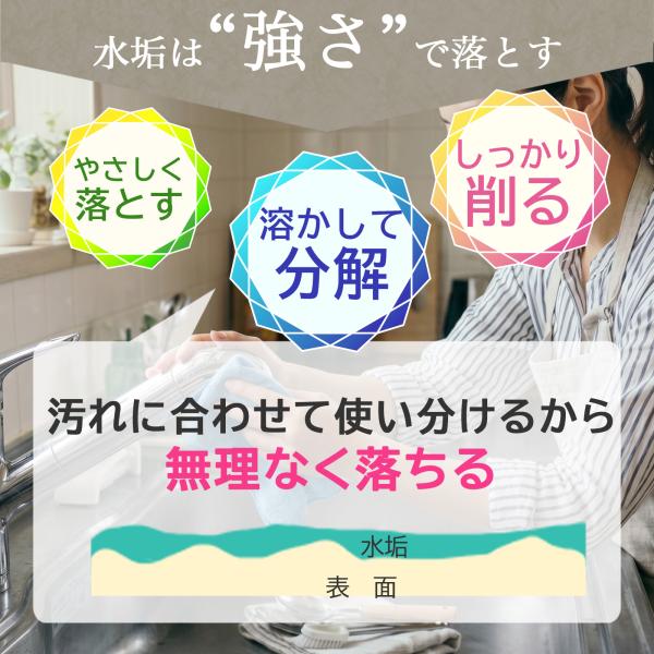 軽いくもりには微粒子研磨タイプ、ザラつきには強力研磨タイプ、クエン酸で落ちない頑固な水垢には溶解除去タイプと、原因別に効率よく対応できます。