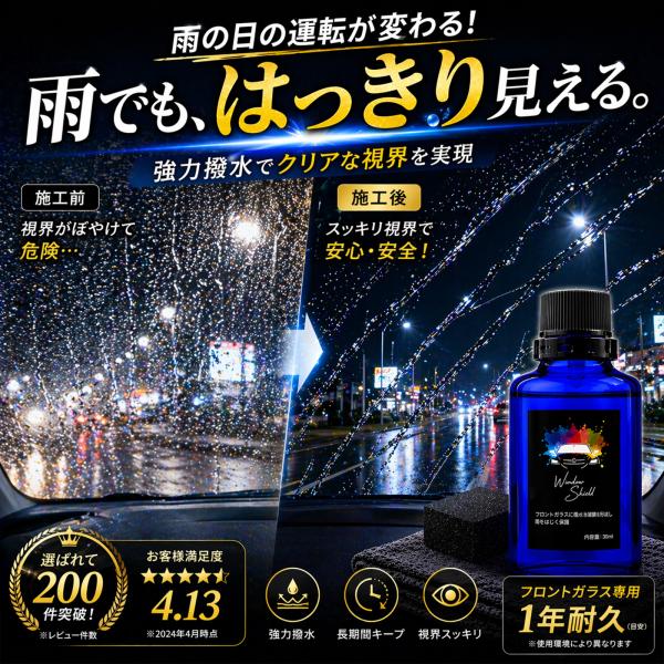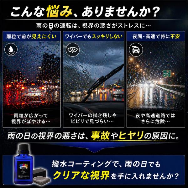 重ね塗りにも対応し、より高い撥水力と耐久性を実現します。フロント・サイド・リアなど全ガラス面に使用可能。