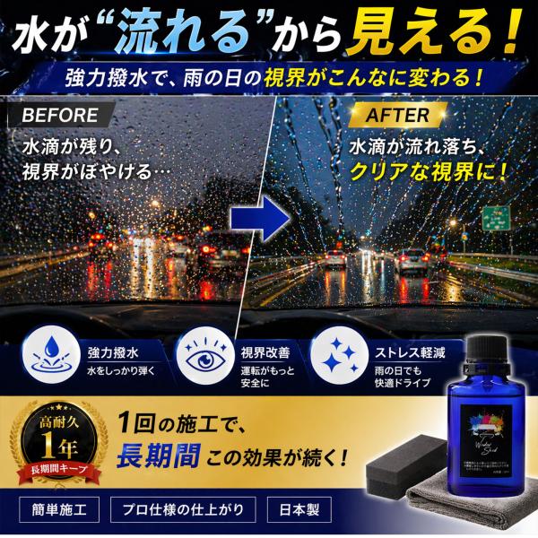 ガラス 撥水剤 超撥水 1年耐久 硬化型 重ね塗り可