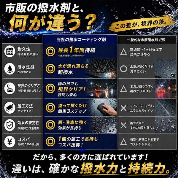 本製品はガラス撥水コーティング・ガラス撥水剤として、超撥水と1年耐久を両立した硬化型タイプです。ガラス撥水最強クラスやガラス撥水ランキング上位商品を比較中の方、ガラス撥水剤おすすめを探しているドライバーにも