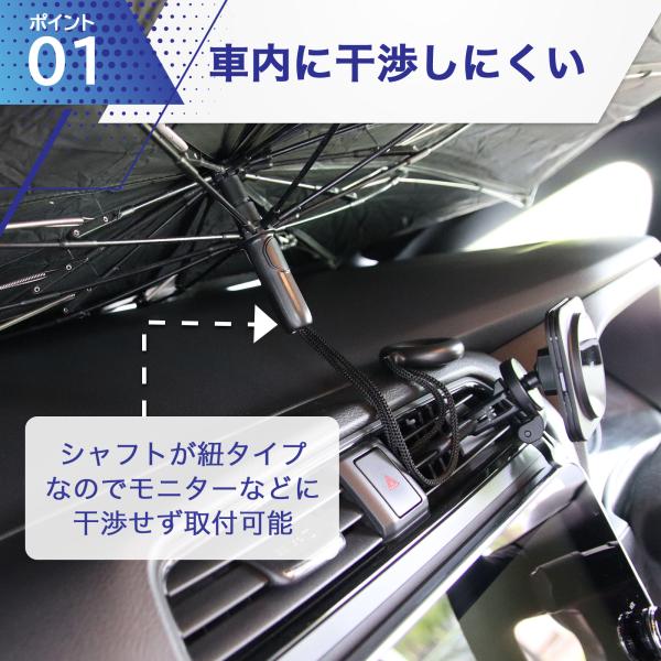 センター紐設計でミラー干渉なし。収納は傘のようにたたむだけ。高齢者やシニアドライバーにもおすすめ。
