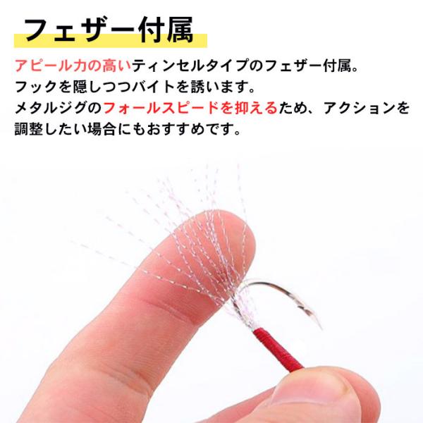 メタルジグの後方に装着するリアフック仕様。太軸・防錆設計で強度抜群。ティンセル付きで視覚アピール力◎。