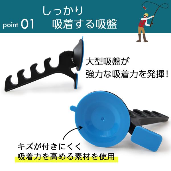 吸着力の高い直径8cm吸盤で、釣り竿・タオル・ウェアなど多用途対応。