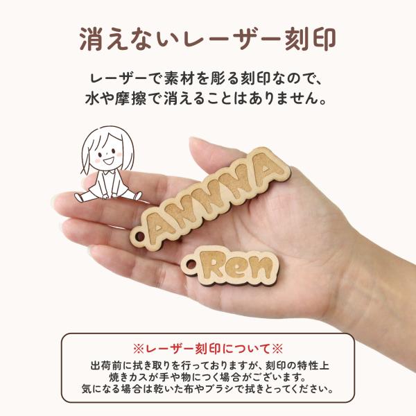 レーザー刻印と精密カットで仕上げているため、印刷のように文字が消える心配がなく、毎日使う持ち物にも安心してお使いいただけます。