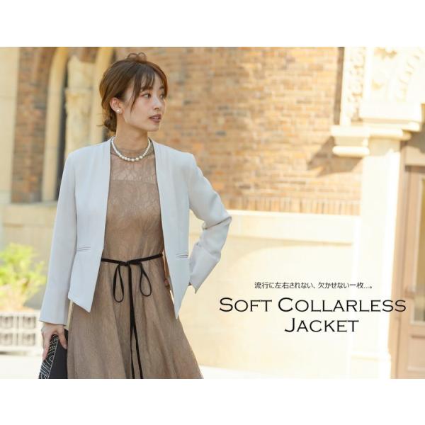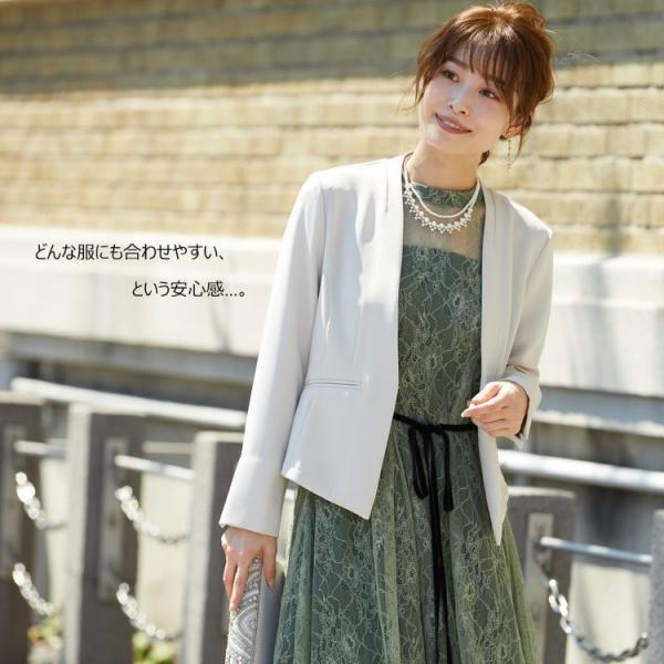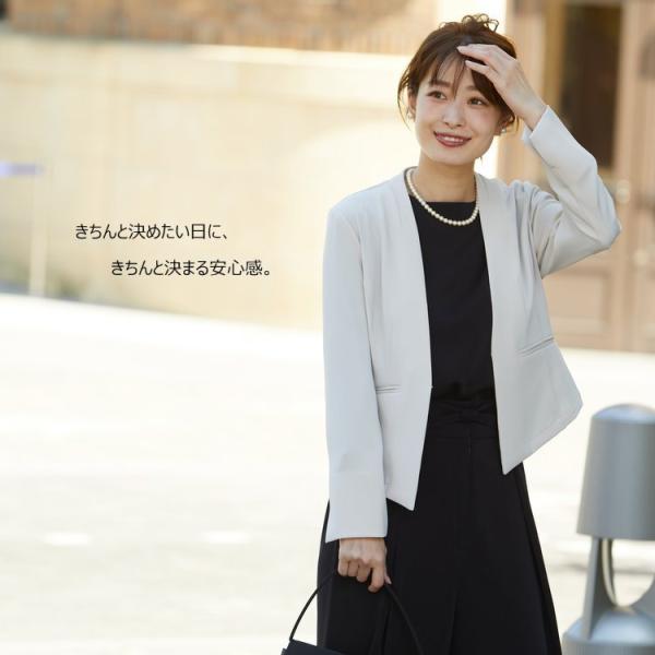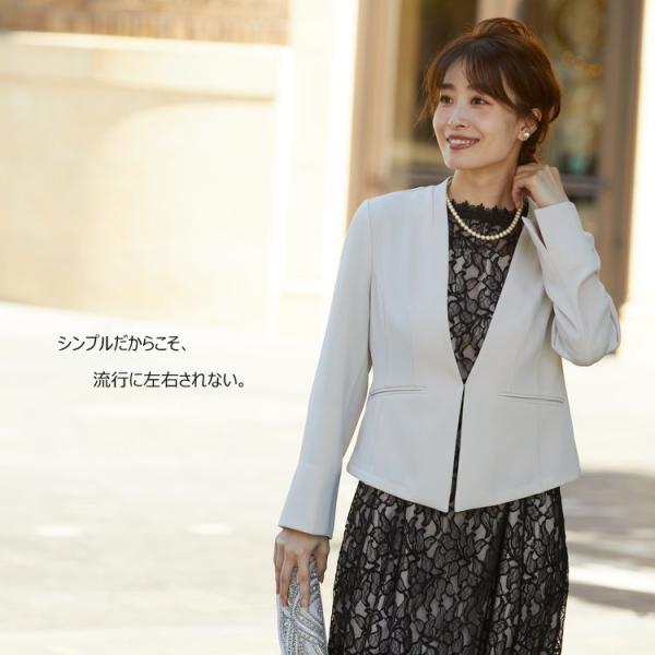 どんなシーンにもきちんと着られて、おしゃれ度もアップする万能ノーカラージャケット。 手持ちのお洋服に合わせやすく、「こんな1枚が欲しかった」と思える逸品です。軽くソフトな風合いの素材を使用し、着心地も◎。パーティーシーンはもちろん、お子様のセレモニーや通勤、ちょっとしたお食事会まで幅広く着まわせます。※リニューアルにより、裏地付き(袖裏地は無し)となりました。