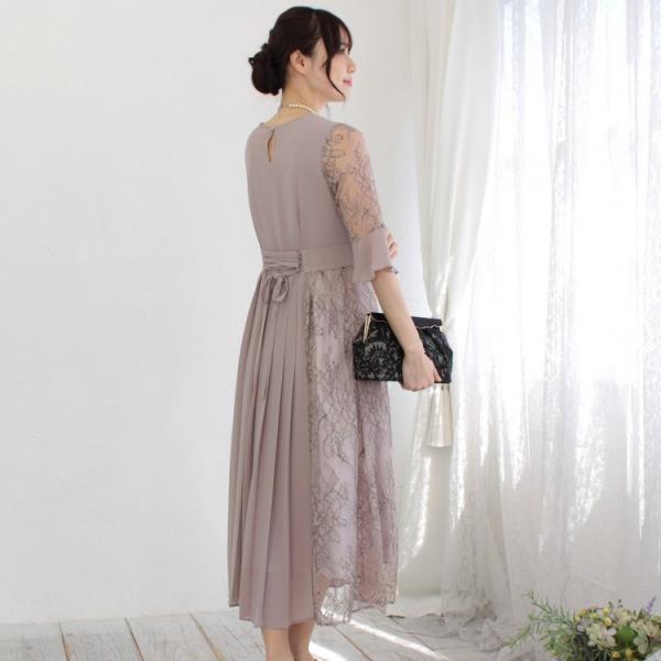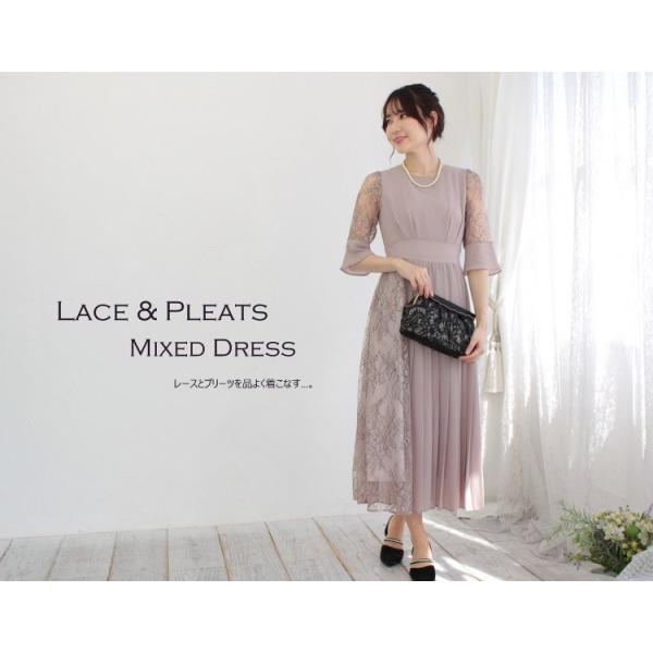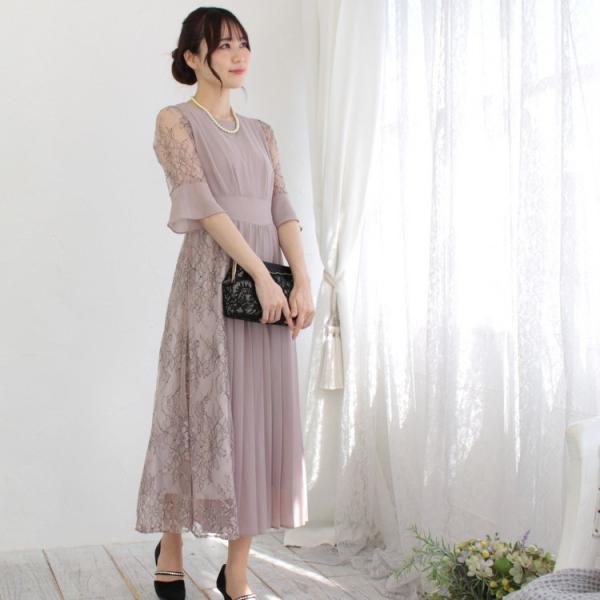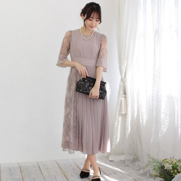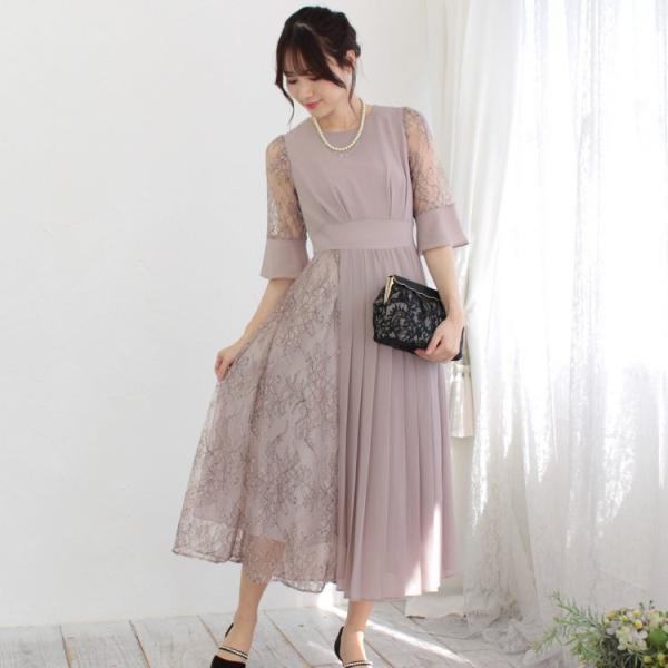 パーティードレス レース&プリーツミックスドレス(ローズベージュ)|プリカ