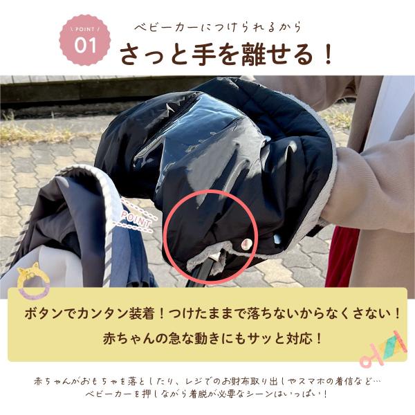 手袋はベビーカーハンドルに固定されるので、めんどくさい脱着も、失くす心配もなし!