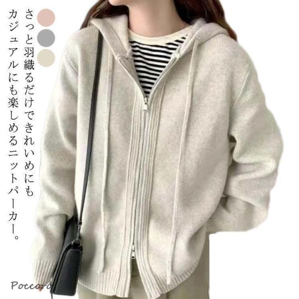 ニットパーカー レディース ダブルジップパーカー ニットカーディガン 無地 ジップアップ プルオーバー 双方向ジッパー フード付き ニット