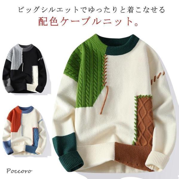 メンズ セーター 厚手 秋 冬 ニット プルオーバー ケーブル編み 配色 ステッチ パッチワーク クルーネック 丸首 オーバーサイズ ニットセーター