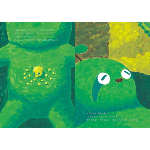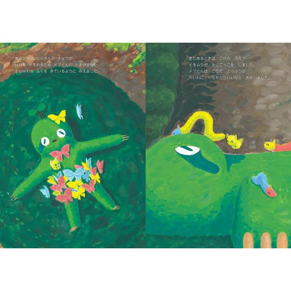 『ナマケモノのメブくん』かやのしんやなにをしてもうまくいかないので、木につかまっているのもめんどうになってしまったのです。あまりにも動かないので、頭から芽が出て、体からコケが生えました。失敗ばかりのメブくんですが、ちいさな命を助けようと動き出します。