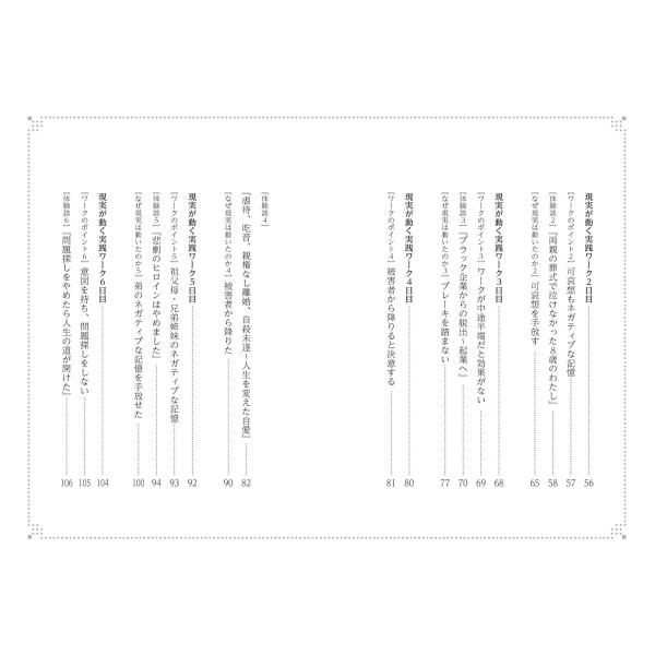 それぞれのワークには、ワークをやるためのポイント、実際に現実を変えてきた7人の体験談と、彼らの現実はなぜ動いたのか、著者からの解説も書かれている。