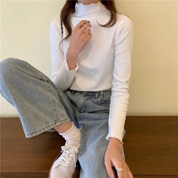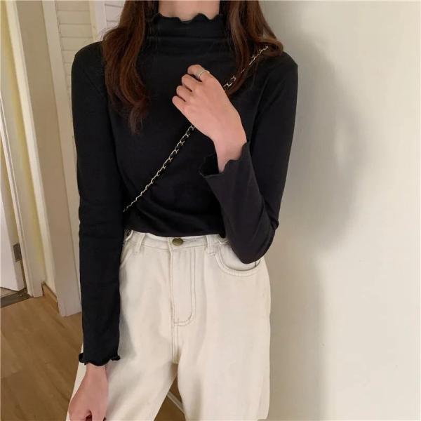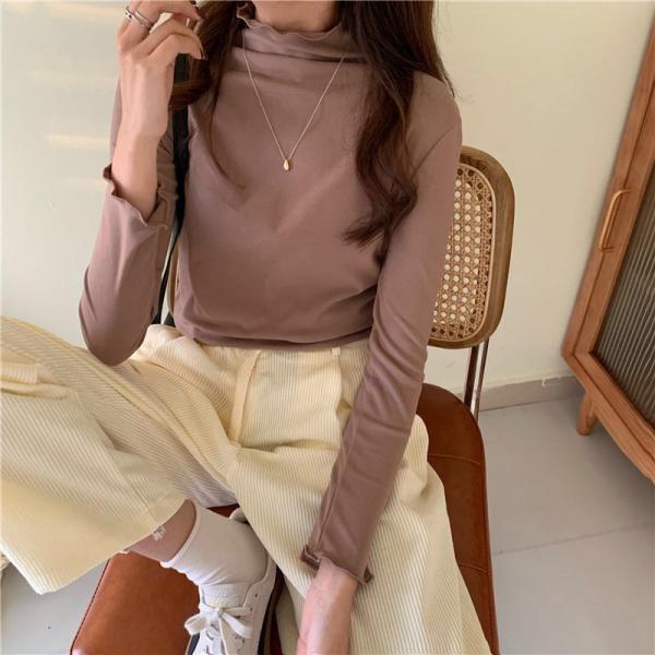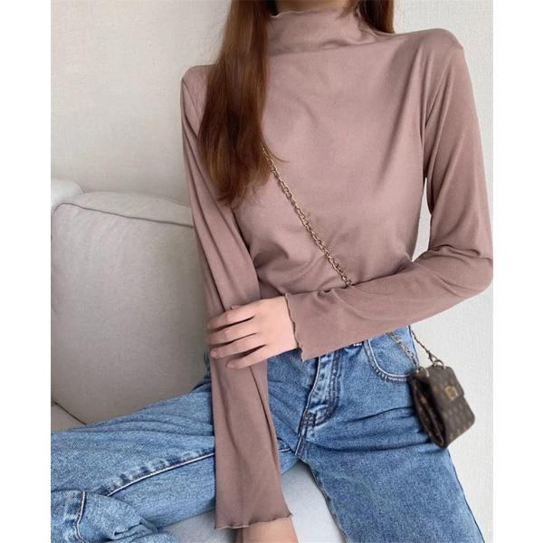 カットソー レディース トップス タートルネック フリル 春秋 冬 インナー 長袖 タートル 無地 重ね着 レイヤード Tシャツ 柔らか 着痩せ 爆買