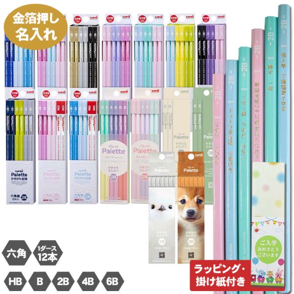 箔押し 名入れ 金 鉛筆 ユニパレット かきかた鉛筆 箔押し 六角軸 ラッピング HB B 2B 4B 6B 1ダース 12本 金箔 名前入り えんぴつ 三菱鉛筆 uni Palette