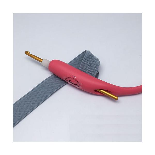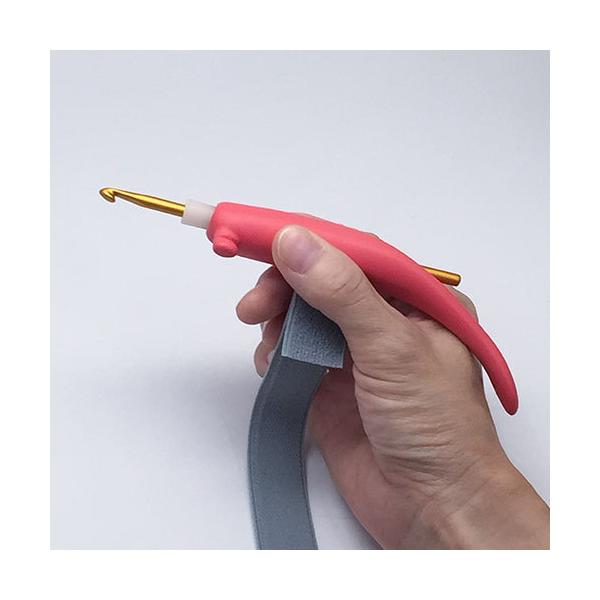 太いグリップで握りやすく、かぎ針を握らなくても補助バンドで手に固定して使用できます。かぎ針が握りにくくなって、かぎ針編みを諦めていた方も再びかぎ針編みができます。