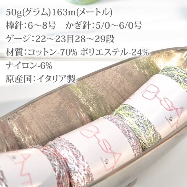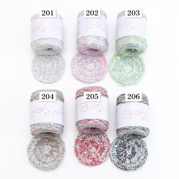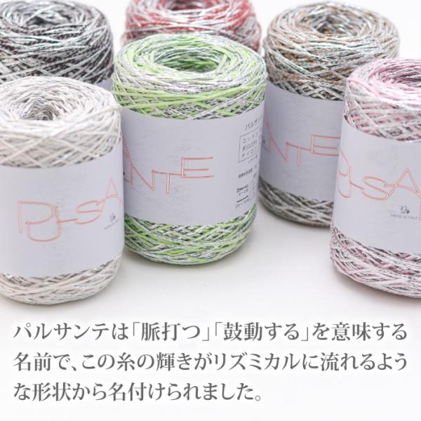 パピー毛糸2026年春夏新商品のパルサンテは「脈打つ」「鼓動する」を意味する名前で、この糸の輝きがリズミカルに流れるような形状から名付けられました。