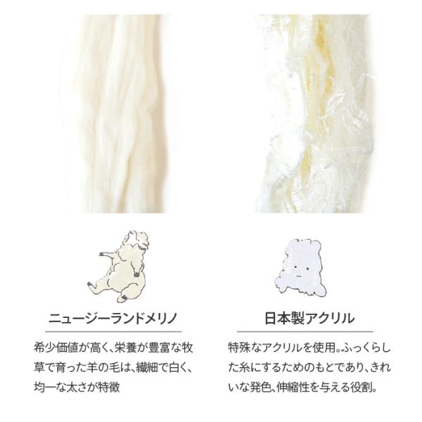 ソフトで強いクリンプ(繊維の縮れ)を持つニュージーランドメリノウールに、バルキー性(膨らむ性質)に富むアクリルを程よくブレンドすることで、肌触りが良く、抜群の弾力性と保温性にも優れた手あみ糸ができました。