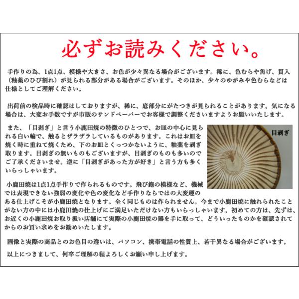 手作りの為、1点1点、模様や大きさ、お色が微妙に異なる場合がございます。稀に、色むらや焦げ、貫入(釉薬のひび割れ)が見られる部分がある場合がございます。