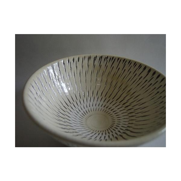 両側とも飛び鉋の入った贅沢な一品。うっすらと見える内側のドーナツ模様は、現代ではほとんど見られなくなった「目剥ぎ」と言う技法。器を窯で焼く時に、上に重ねて焼く為に出来る模様です。