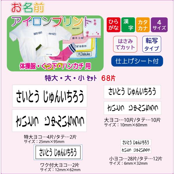 お名前アイロンプリント 特大・大・小セット(68片)黒文字・転写タイプ 体操着・ハンカチ・くつ下用 衣類 全シール68片