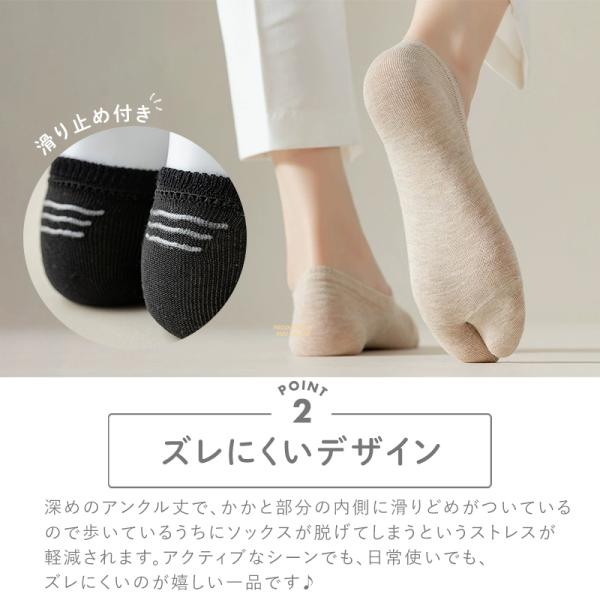 深めのアンクル丈で、かかと部分の内側に滑りどめがついているので