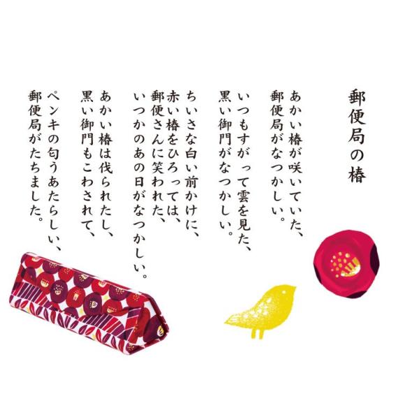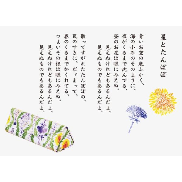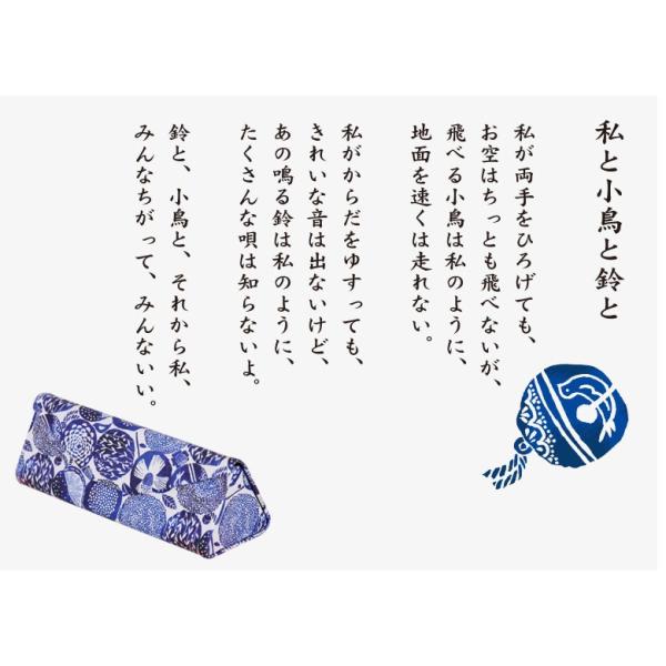 郵便局の椿、私と小鳥と鈴と、など金子みすゞの詩とデザインがひとつになって、表現されるみすゞ詩の世界観が楽しめる、コンパクトに折りたたみできるメガネケースです。