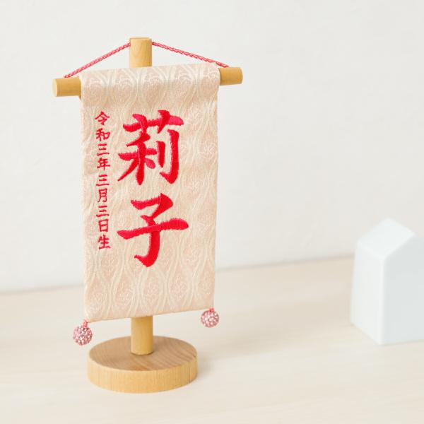 女の子向けの華やかな「赤」「サーモンピンク」「ピンク」「ベージュ」の4種類から選べる刺繍名前旗です。繊細な刺繍でお子さまのお名前や生年月日を施します。小さめのお人形にもぴったりの超コンパクトなサイズ感なので、一緒にお飾りいただくと節句をいっそう華やかに演出してくれます。当店オリジナル雛人形ブランド『小さなおひな様 ぷりふあ』とも相性抜群です。