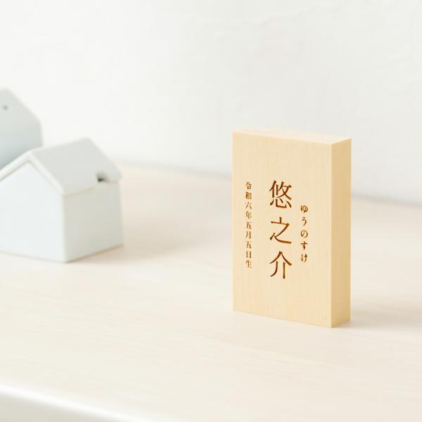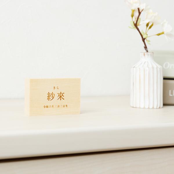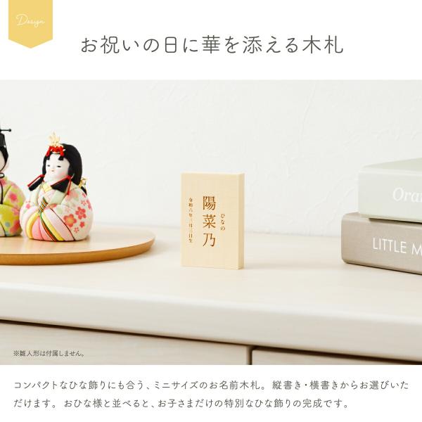 木のぬくもりが優しい風合いを醸し出す、小さいサイズのお名前木札。ぷりふあシリーズなどのコンパクトなおひな様によく合うミニサイズです。縦書き・横書きから選ぶことができ、ローマ字にも対応。クラシカル、モダン、あらゆるスタイルの雛人形に合わせておしゃれにお楽しみいただけます。ナチュラルな木の色合いは、インテリアの雰囲気を損ないません。ひな祭りでお雛様と一緒に飾るのはもちろん、初節句などの記念撮影にも大活躍。ギフトとしてもおすすめです。