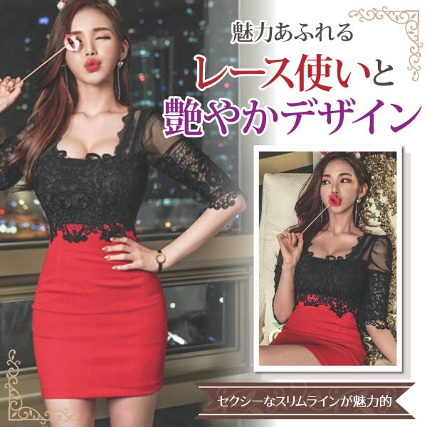 ナイトドレス キャバドレス ミニドレス ハイウエスト タイト ワンピース 五分袖 スクエアカット 刺繍 レース レディース グラシア