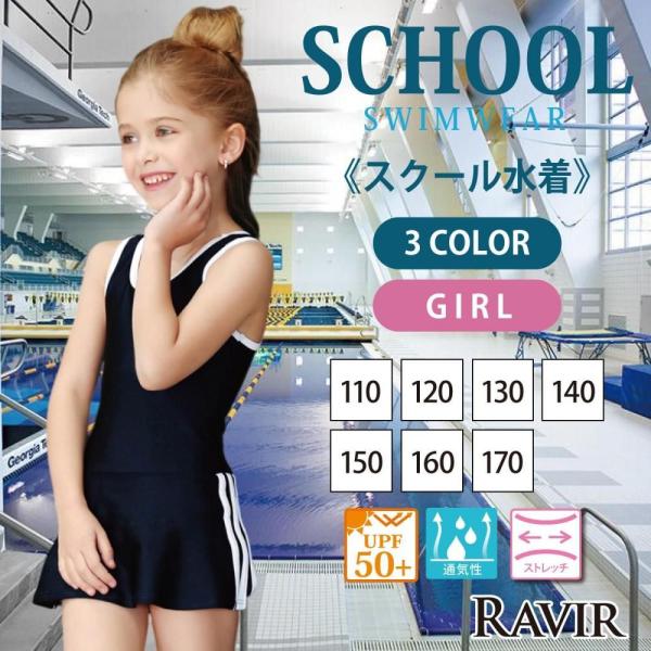スクール 水着 キッズ 子供用 女の子 ワンピース インパン付 UVカット 三本ライン アクセント シンプル スタイリッシュ
